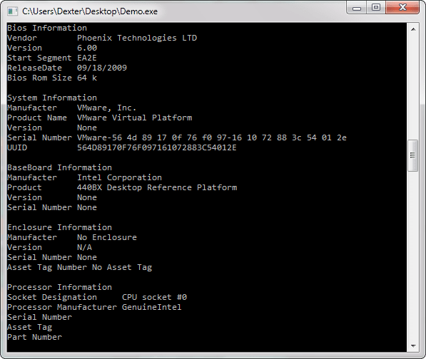 Now which you know the basics about the SMBios table structures, you need a way to retrieve such tables. the WMI provides a way to get the raw SMBIOS data in a single buffer using the class MSSmBios_RawSMBiosTables this class is in the root\WMI namespace and is available since Windows XP.