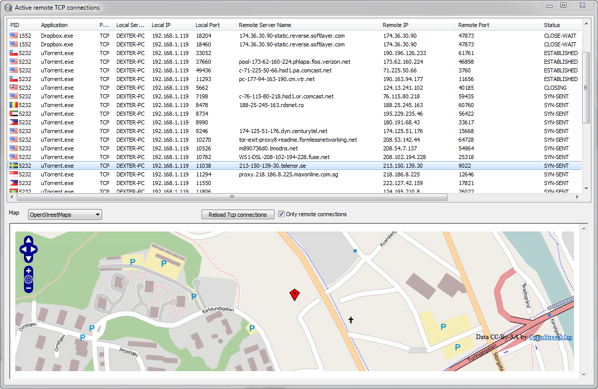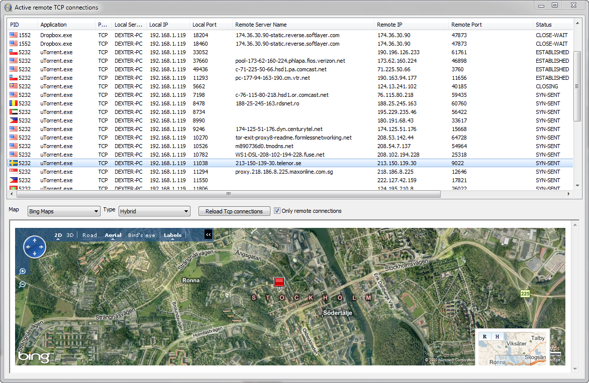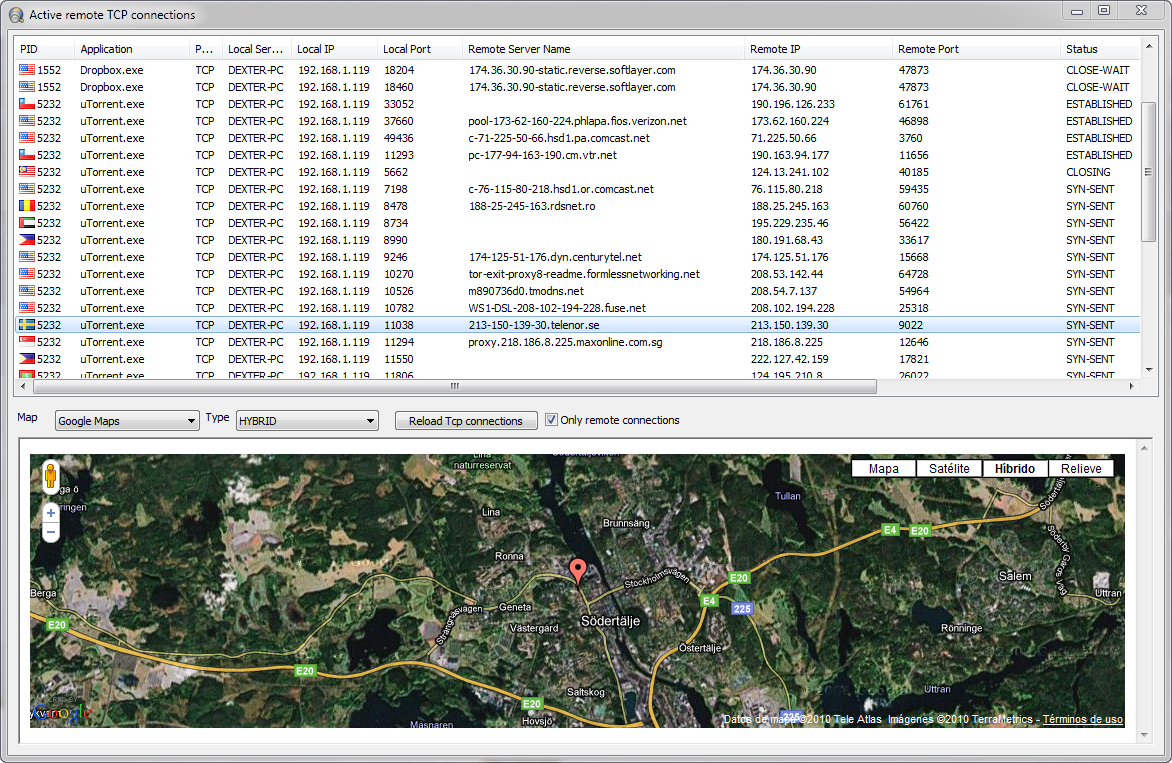 I’ve been looking for more applications for the ip geolocation. so I wrote this small tool wich show the open remote tcp connections location on a Web Map (Google Maps, Bing Maps, Yahoo Maps and OpenStreetMap).